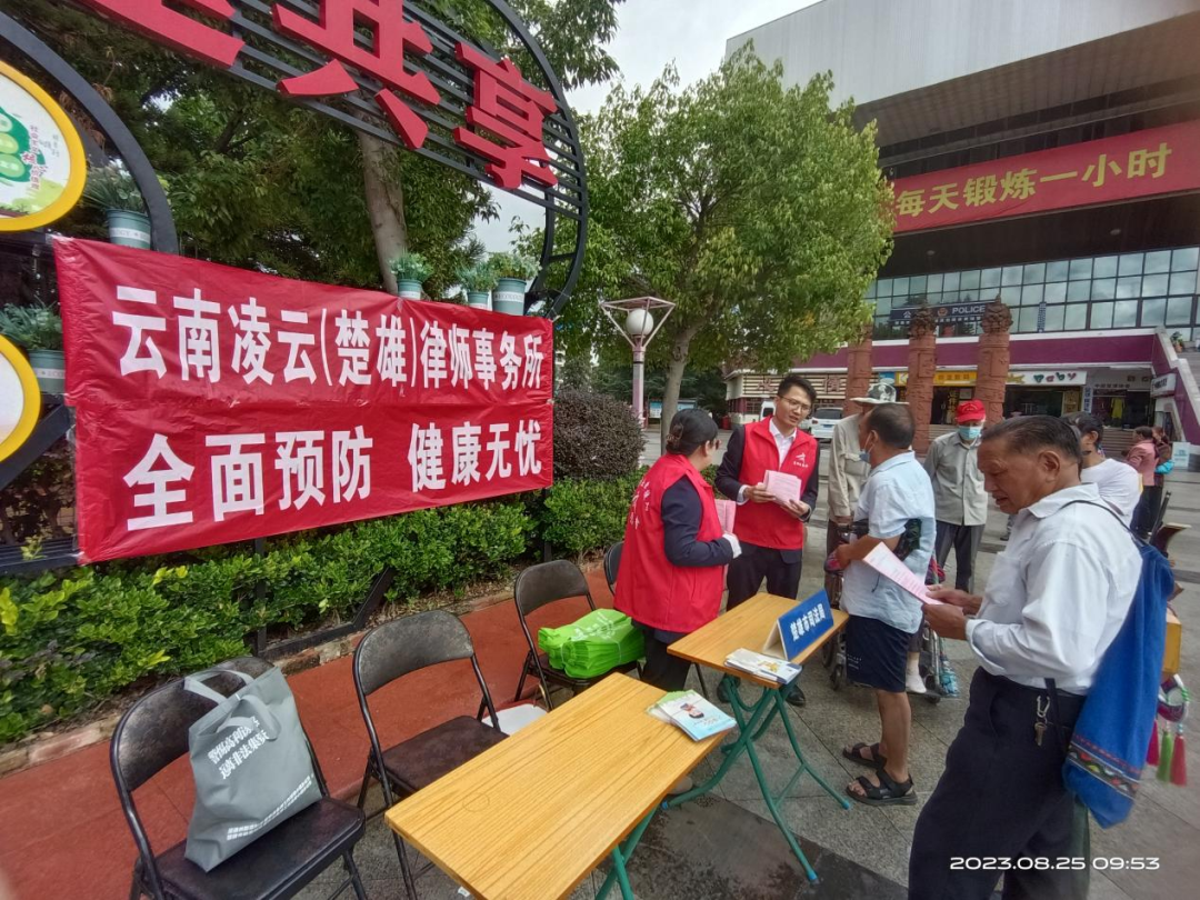 8月25日,根据楚雄州人民政府残疾人工作委员会办公室《关于组织开展第七次残疾预防日宣传教育活动的通知》文件精神,在楚雄市司法局组织安排下,云南凌云(楚雄)律师事务所执行委员会主任杨晓宇律师带领王鑫玥、李雅琦和罗元扬三位实习律师到楚雄市桃园湖广场举行“全面预防 健康无忧”法律宣传活动。