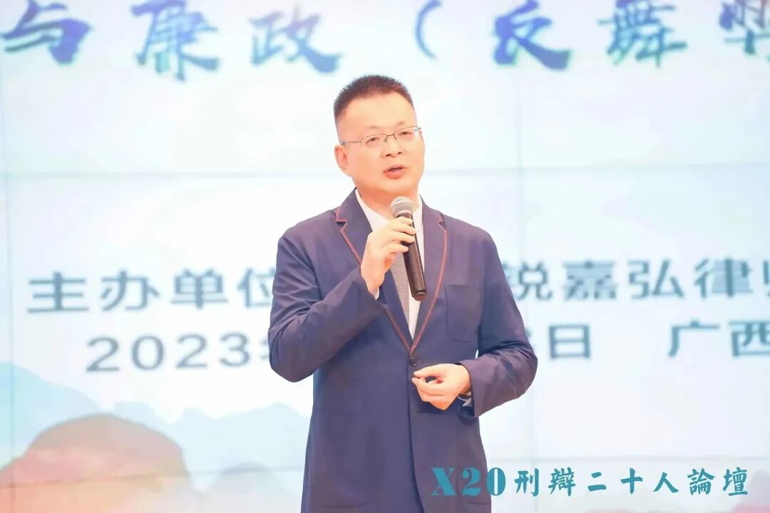 刑辩二十人论坛发起人、广西锐嘉弘律师事务所主任伍志锐代表主办方为本次论坛开幕致辞。伍志锐对远道而来参与刑辩二十人论坛的各位嘉宾、律师同仁以及企业家们表示热烈的欢迎。他阐明了“刑辩二十人论坛”是民间性学术与实务研究论坛,不是任何形式的律师和律师事务所联合体,也不是任何形式的社会组织,旨在学习和坚持二十大精神,通过开展研讨会、论坛、培训等活动,探讨新时代背景下的法治建设和刑辩业务技能,整合刑辩资源,发现刑辩人才,协同开展刑辩实务研究,为刑辩事业拓展新空间提供思路和探索。他表示今年是全面贯彻落实党的二十大精神开局之年,为打赢反腐败斗争攻坚战和持久战而展开的一系列更加严格的反腐工作均表明职务犯罪案件将呈现持续多发态势,同时也将面临一些新情况和新问题。对于刑辩律师而言,如何做好新形势下监察体制主导下的职务犯罪案件辩护,如何才能更好地为企业服务,推进企业反舞弊治理合规非常值得研究探讨。希望各位学者同仁在本次论坛中能够深入对话和交流,为打赢反腐败攻坚战持久战贡献力量,并共同推动刑事业务的发展,推动法治进步,传播刑辩正能量。伍志锐随后还对广西锐嘉弘律师事务所进行了介绍,他表示相信经过本次论坛,锐嘉弘律师事务所一定会站的更高,看的更远,为社会提供更加优质、高效的法律服务。最后,伍志锐预祝本次论坛取得圆满成功。