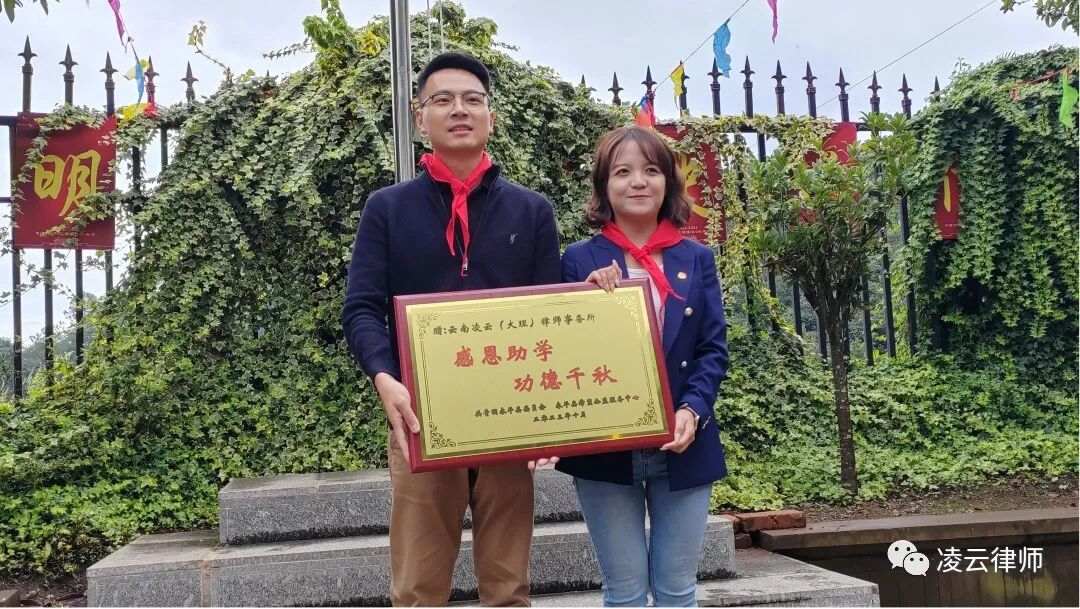 共青团永平县委书记高晓鹃代表团县委、县希望公益服务中心向律所回赠“感恩助学,功德千秋”牌匾。