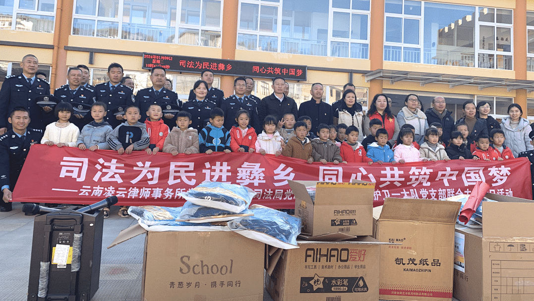 2024年1月9日,在红塔区司法局党总支的牵头下,云南凌云律师事务所党委、凌云玉溪分所党支部、云南省第三戒毒所警戒护卫一大队党支部、小石桥乡小石桥社区党总支,以及小石桥乡中心幼儿园党支部,到玉溪市红塔区小石桥乡中心幼儿园举办了“司法为民进彝乡,同心共筑中国梦”主题党日活动暨“小爱大义”民族团结公益社公益捐赠活动,为小石桥中心幼儿园的孩子送去了寒冬里的一份温暖。