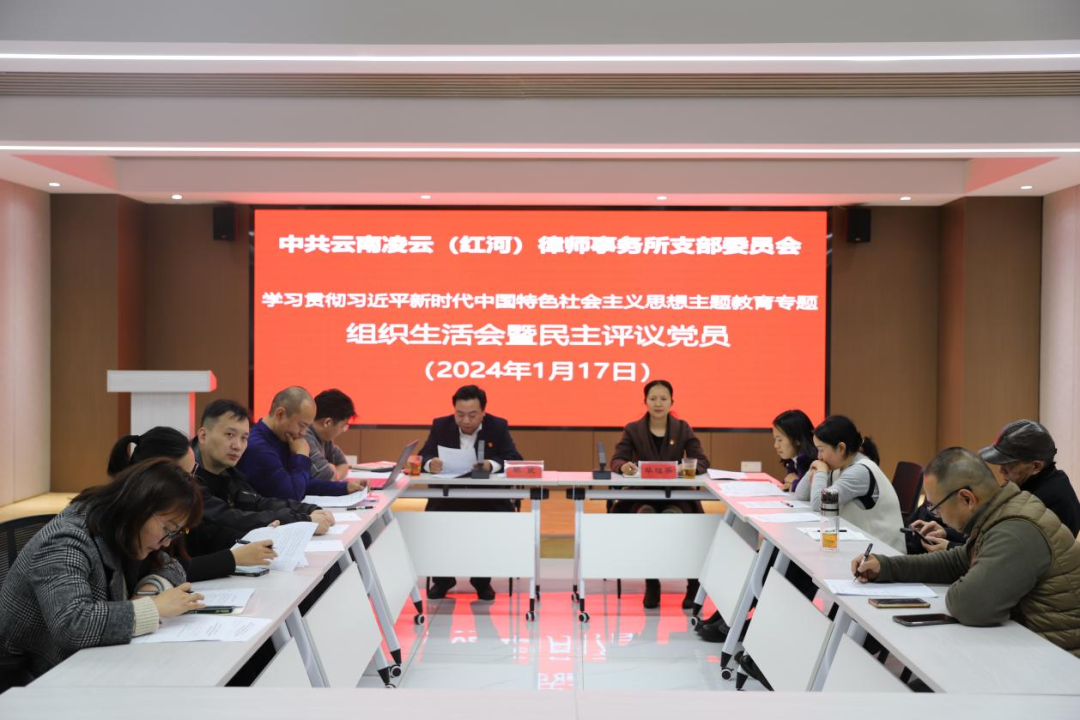 为加强党的政治建设,严肃党的组织生活,2024年1月17日,我所红河办公室党支部召开学习贯彻习近平新时代中国特色社会主义思想主题教育专题组织生活会暨民主评议党员会议。州法律服务行业党委专职副书记毕桂芬莅临指导,在所10名党员及5名群众代表参加会议。