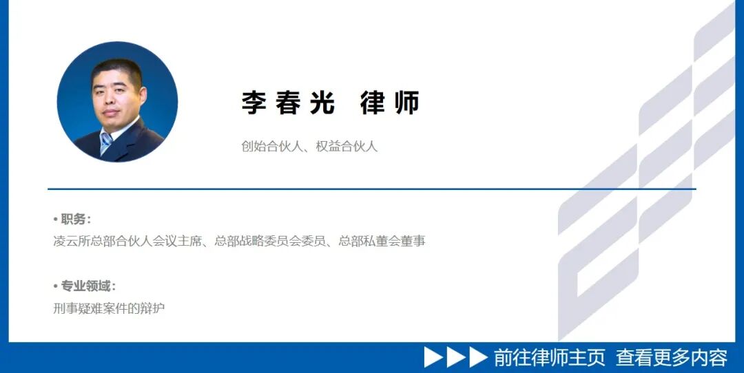 “没有无问题的证据,也没有无辩点的案件。”律师的成长在李春光律师看来,有四个阶段,专业→敬业→卓越→超越。专业是律师入门最基本的要求也是执业的底线,同时,仅仅做到如此是远不够的。刑事律师要怀有敬畏之心,强化全流程服务链条意识,才能反馈当事人及其家属所需的情绪价值;同时应不断更新自己的思维和知识库,才能及时、精确地反馈当事人及其家属重视的问题,在不断进行自我提升的过程中真正为当事人解决问题,提供专业价值。随着公检法机关专业性的提高,案件定性、证据搜集日趋规范,但在全面阅卷之前忌先入为主作出经验判断,必须专注于案件的办理,若经全面阅卷、审查若有一线生机亦应该全力以赴。