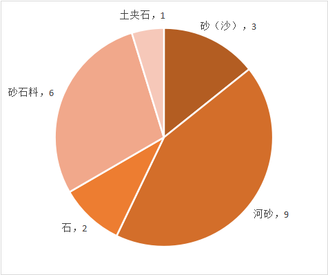 从未列名具体矿产的判例看,砂(沙)3件,河砂9件,石2件,砂石料6件,土夹石1件。