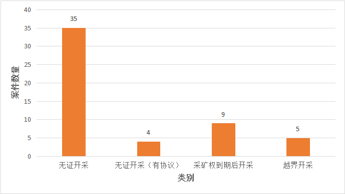从非法的类型上看,最主要的情况是无许可证开采,即偷矿。除此之外有4件案件,被告人虽与土地使用权所有人签订了相关租赁协议,但未办理开采许可证,同样属于无证开采。此外,还涉及采矿权到期后继续开采、越界开采的情况,两者共11案,其中有3案,同时存在采矿权到期后继续开采、越界开采两种情况。