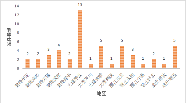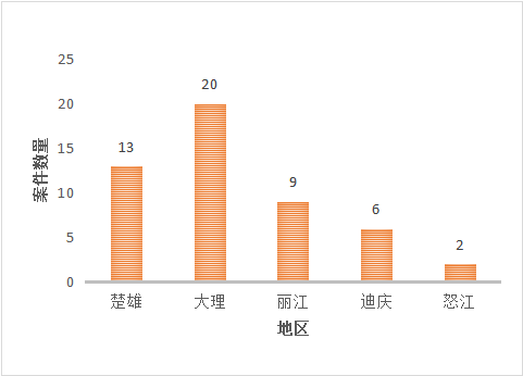 从5市(州)案件分布情况看,大理>楚雄>丽江>迪庆>怒江,这与5市(州)人口数量的多少基本是对应的,除了迪庆和怒江对比存在一定差异。