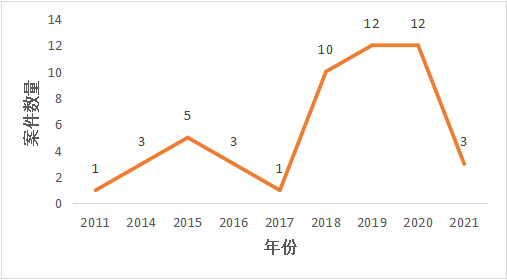但2021年只检索到3个案件,这一结果不排除两种可能性:第一,部分2021年判例尚未上网;第二,今年裁判文书上网政策调整所致。