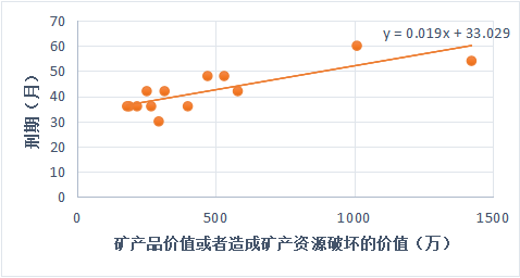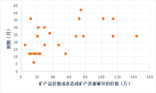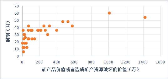 除去以上提到的几个特例,共有40个判例,这40个判例中开采的矿产品价值或者造成矿产资源破坏的价值-刑期的关系如下:
