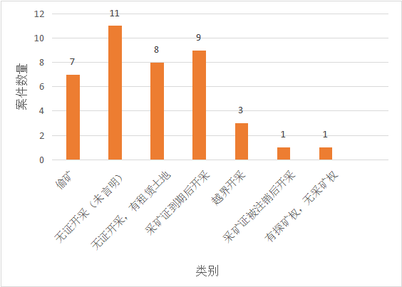 从非法的类型上看,除了没有写明相关情况的案件,主要有几种类型:偷矿和无证开采、无证开采但与村集体等有土地租赁协议、采矿权到期后继续开采,此外,越界开采、采矿权被注销等有所涉及。