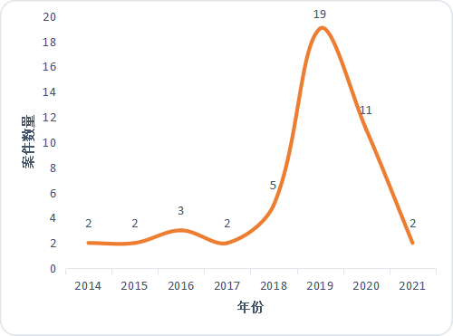 从所检索裁判文书作出时间看,46个案件都是在2014至2021年之间作出。2014年至2017年每年都维持在2至3个案件,2018年至2020年案件明显增多,最多于2019年有19个,这与近年自然资源相关执法力度加大的政策相吻合。但2021年案件只检索到2个,这一结果不排除两种可能性:第一,部分2021年判例尚未上网;第二,今年裁判文书上网政策调整所致。