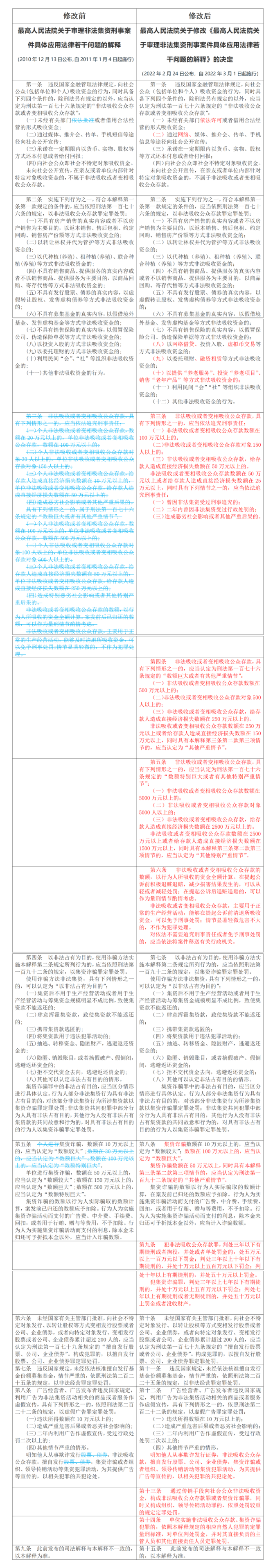 2022年2月24日,最高人民法院发布《关于修改〈最高人民法院关于审理非法集资刑事案件具体应用法律若干问题的解释〉的决定》(法释[2022]5号),对2010年出台的司法解释(以下简称原解释)作了若干重大修改,并定于3月1日正施行。本次修改既是《刑法修正案(十一)》生效实施后对旧司法解释修改的硬性要求。如《刑修十一》对非法吸收公众存款罪由两档量刑修改为三档量刑,集资诈骗罪则由三档量刑修改为两档量刑;还修改了各档量刑的量刑幅度及修改了财产刑的数额、种类等。