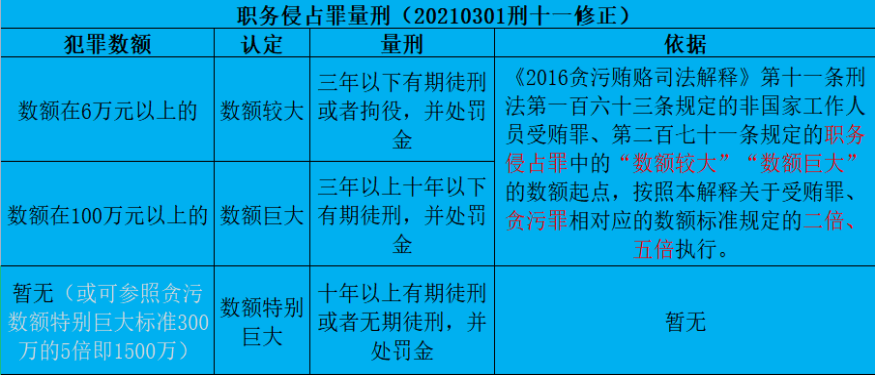 在此,刑法修正案(十一)对职务侵占罪进行了修改,其中最大变化是将两档量刑修改为三档量刑。这一修改进一步完善了刑法条文,但也由此留下了部分司法解释空白,亟待完善。