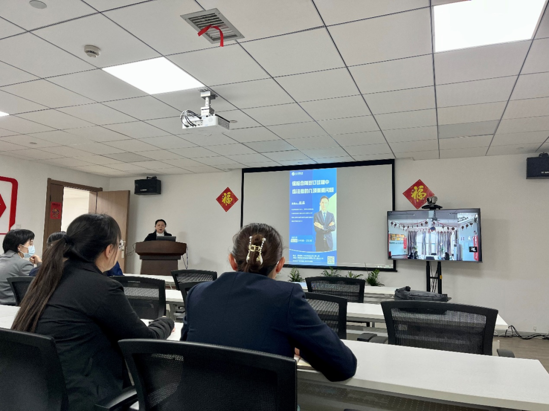 讲座开始,彭泽律师结合自身案件办理情况,向顾问单位员工阐明了合同审查的重要性。然后在一个半小时的培训中,彭泽律师主要按照《民法典》第四百七十条的规定,详细讲解了什么是“合同八大必备条款”,以及从审查主体资质和资信情况、规范用语和争议解决等九个方面讲解了拟定合同应注意的九大问题。最后,彭泽律师还针对顾问单位的业务方向,结合自己所承办的保险合同纠纷案例,向顾问单位讲解了履行保险合同提示说明义务和将保险合同条款送达投保人的重要性,并对如何履行提示说明义务和进行通知送达提出了切实可行的律师建议。