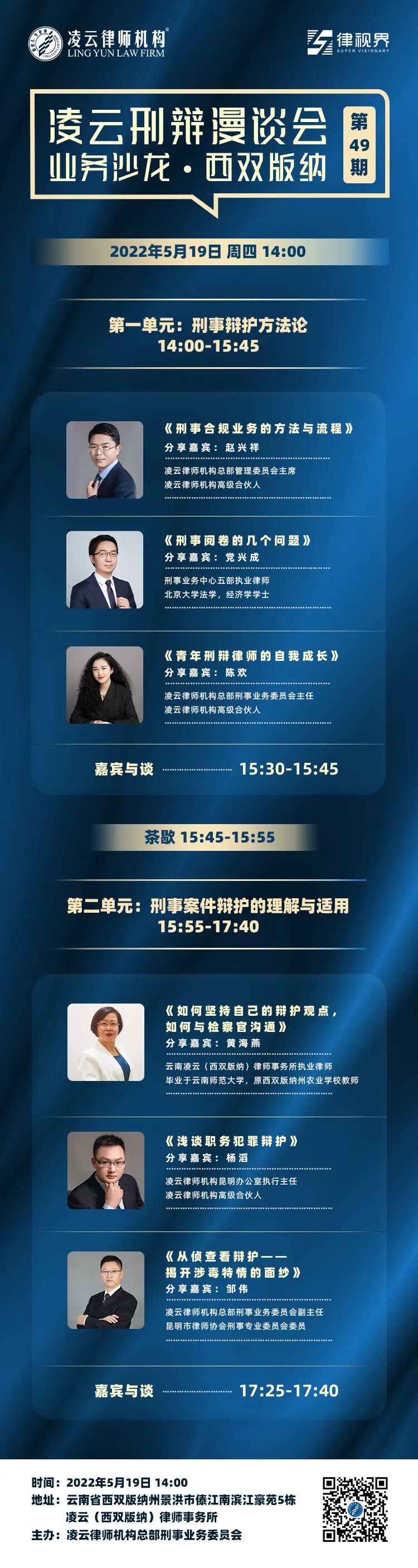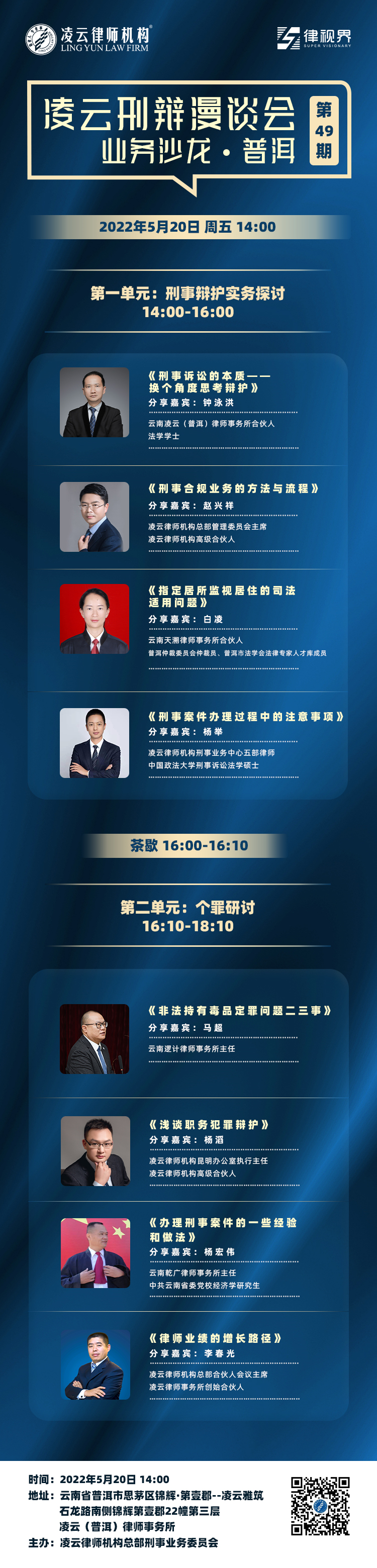 第49期凌云刑辩漫谈会·业务沙龙西双版纳站和普洱站将分别于2022年5月19、20日14:00于凌云(西双版纳)律师事务所和凌云(普洱)律师事务所举行。
