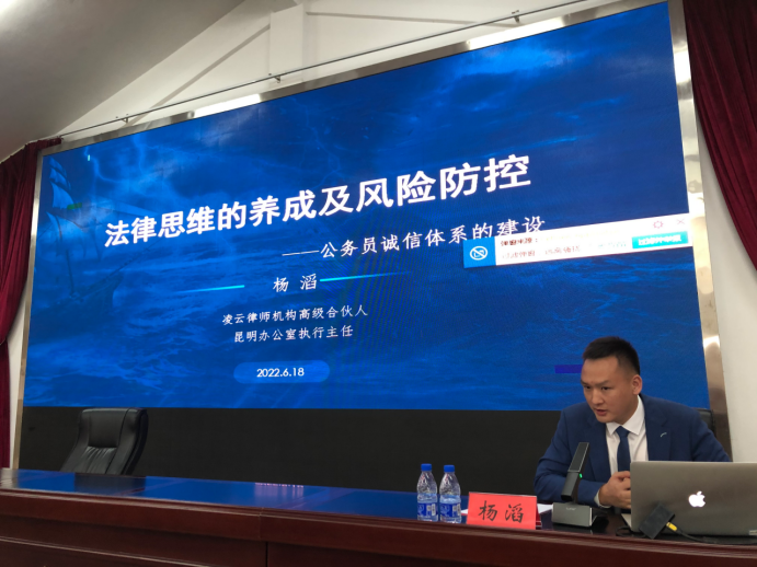 2022年6月18日,我所高级合伙人、战略委员会委员、昆明办公室执行委员会主任杨滔律师应邀以《法律思维的养成及风险防控——公务员诚信体系的建设》为题,结合自身办案经历,分享了稳定、健全的营商环境是招商引资的基础,良好的治安环境是社会发展的根基;并以鲜活的案例警示,社会矛盾的化解需在雏形时,身为公职人员应以身作则,诚信、廉洁、干净、担当不仅是新时代领导干部的底色,更是正确领导的引航灯,贪腐案件的发生往往就是理想信念动摇、宗旨意识淡化、“三观” 的扭曲。公职人员应知法懂法守法,充分利用法律思维,树立风险防范意识,建立诚信体系。