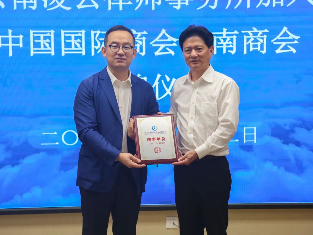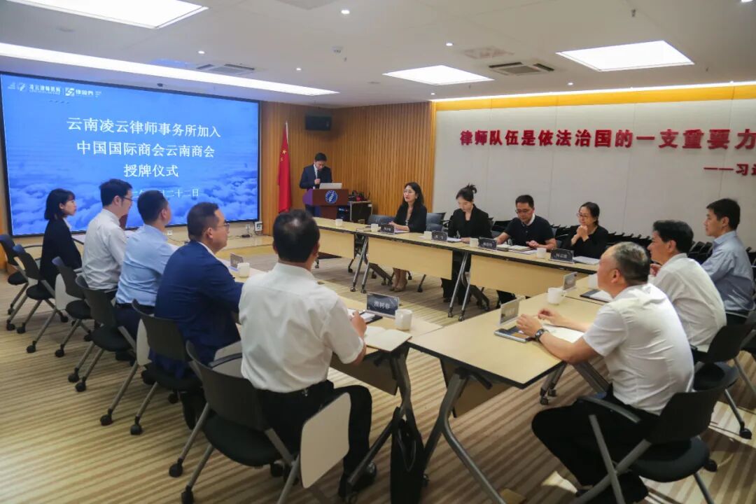 云南凌云律师事务所加入中国国际商会云南商会、云南省国际贸易投资商会(以下简称“云南国际商会”)并成为理事单位。6月22日,云南国际商会秘书长母建生、副秘书长段朝辉、办公室主任濮树春莅临凌云所并出席授牌和交流活动。