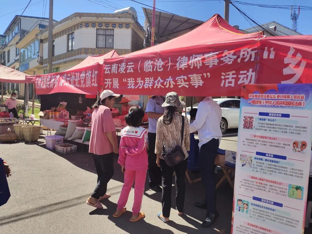 凌云临沧所律师与平村乡派出所民警深入集贸市场,通过设立咨询点、发放法治宣传资料、摆放宣传海报等形式,与农民群众零距离接触,面对面沟通,向群众重点宣传《民法典》及相关法律法规。