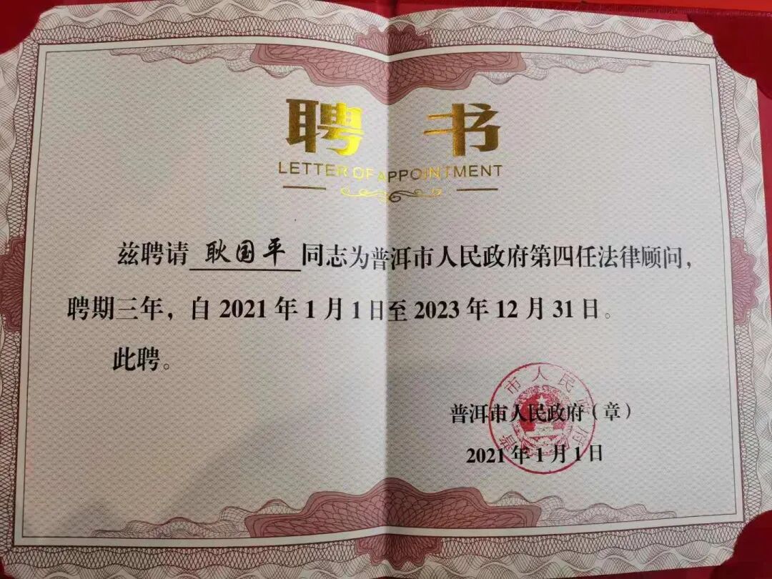 2021年8月20日,普洱市人民政府驻昆办事处举办普洱市人民政府政府第四任法律顾问聘任仪式,我所副主任耿国平受聘为第四任政府法律顾问,聘期为三年。