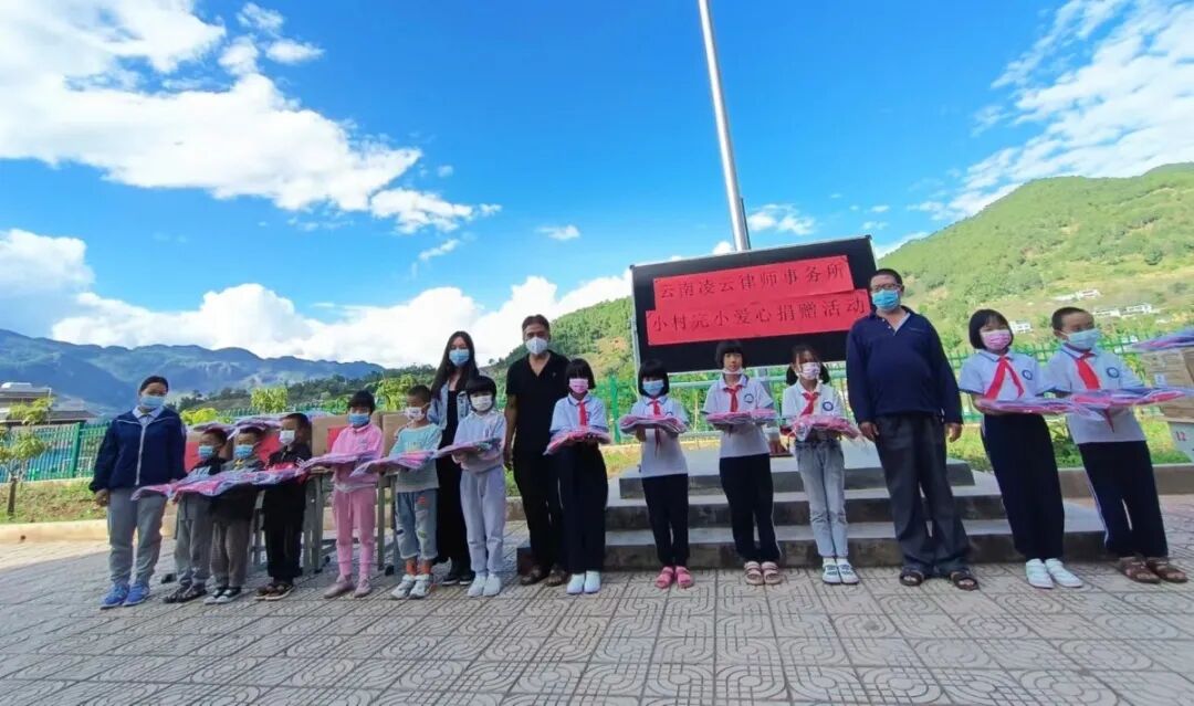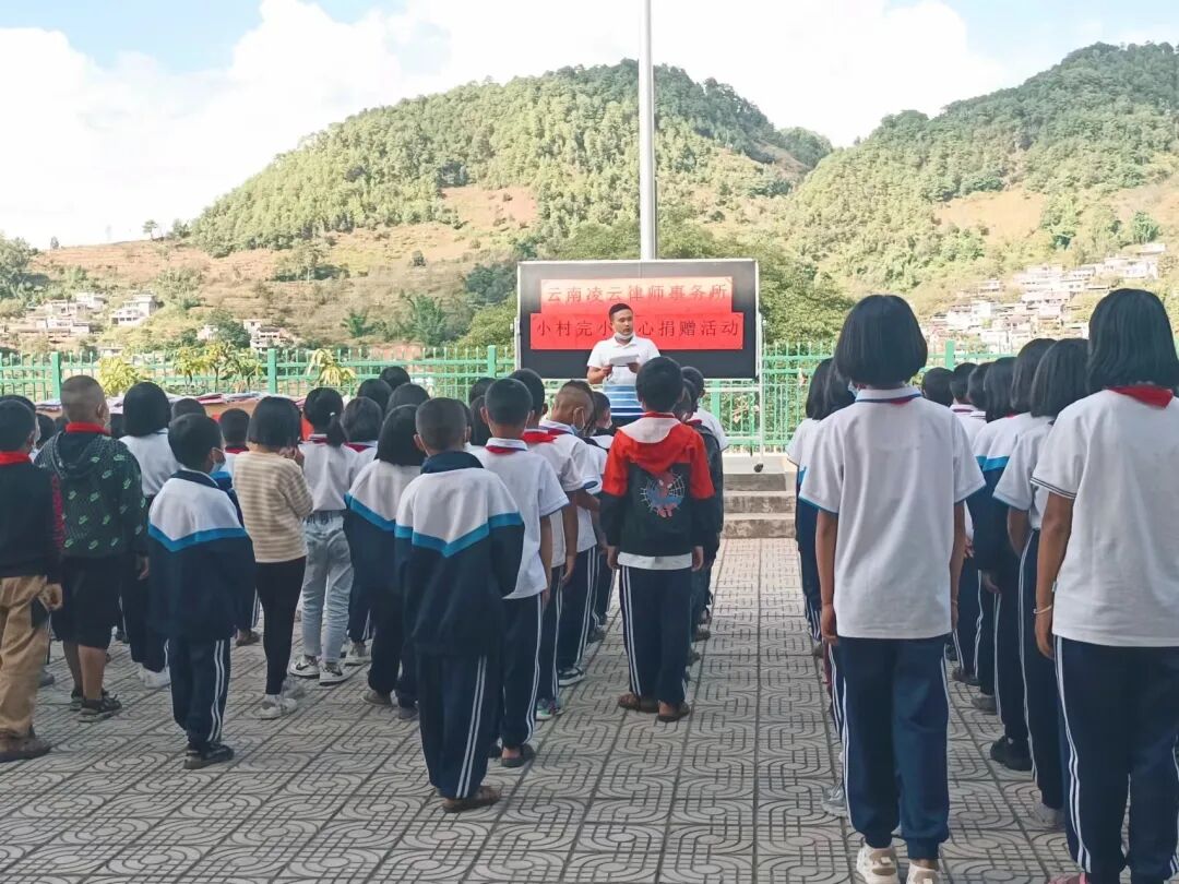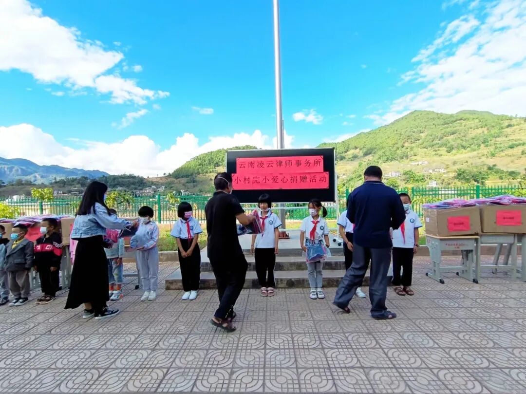 2022年10月24日上午,凌云“小爱大义”冬季校服捐赠行动在临沧市永德县乌木龙彝族乡小村完小成功举办,这是凌云第二次向小村完小捐赠校服。此次活动由临沧市司法局、律师协会发起,凌云律师事务所总部及临沧办公室具体承办。