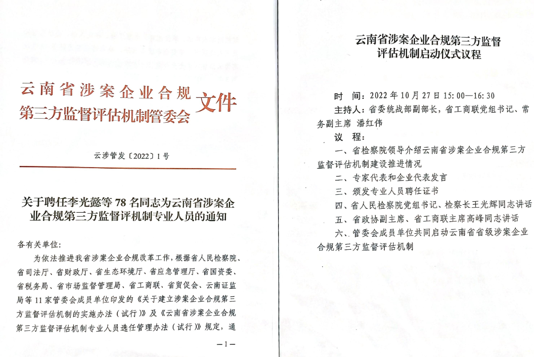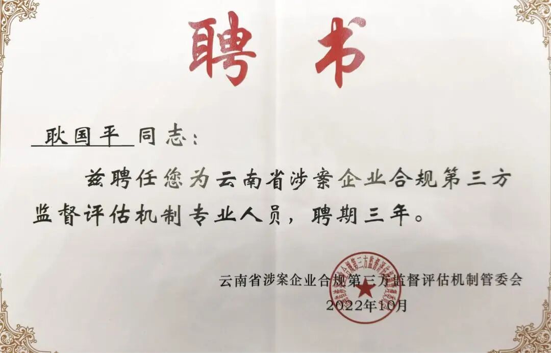 凌云资讯 | 我所耿国平律师荣聘为云南省涉案企业合规第三方监督评估机制专业人员