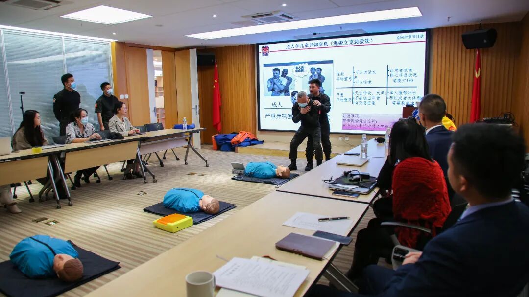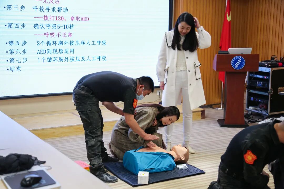 在讲座中,成刚从急救概论及急救寄基础出发,给参训人员详细介绍了心肺复苏与海姆立克急救两项急救方法的要领,并介绍了自动体外除颤器(AED)的使用方法。
