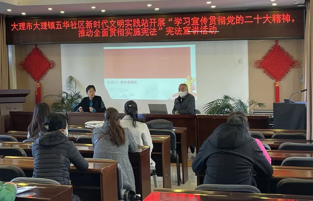 2022年12月8日上午,凌云(大理)律师事务所副主任李学清律师应邀前往大理镇五华社区参加“学习贯彻党的二十大精神,推动全面贯彻实施宪法”宪法宣讲活动,为社区党员专题解读《中华人民共和国宪法修正案》。