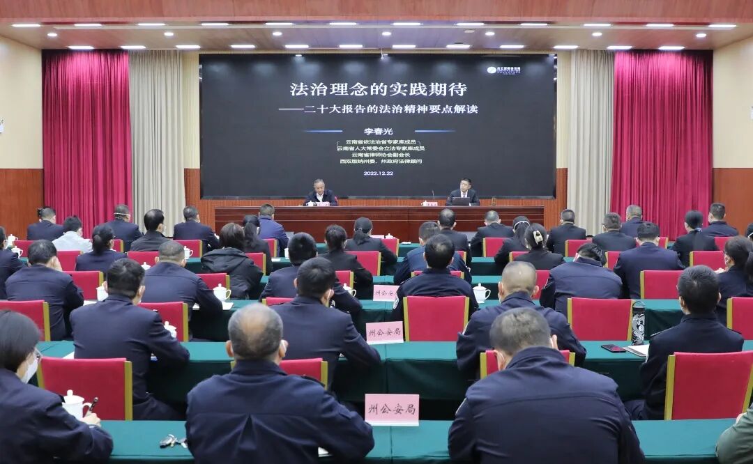 为进一步深入学习宣传党的二十大精神,推动党的二十大作出的各项决策部署在全州政法系统落地落细,12月23日,西双版纳州召开政法领导干部政治轮训暨“双百”报告会,副州长、州公安局局长李力主持,凌云律师事务所合伙人会议主席李春光作专题宣讲。