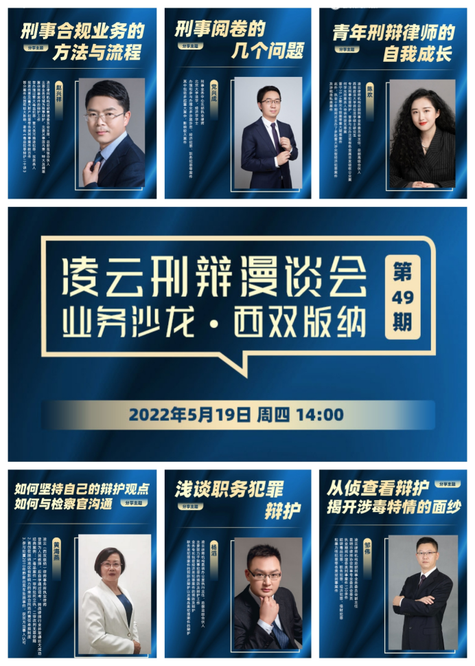 凌云律师机构在云南省内享有14家分所,为增强与各地分所之间的交流,加深各地分所对刑事辩护工作各方面的深稽博考、精研覃思,凌云律师机构总部刑事专业委员会分别于2022年3月17日、5月19、20日在凌云(曲靖)、凌云(西双版纳)、凌云(普洱)律师事务所开展刑辩业务沙龙,共计16位分享嘉宾进行了23场次主题分享,与会人数达百余人。