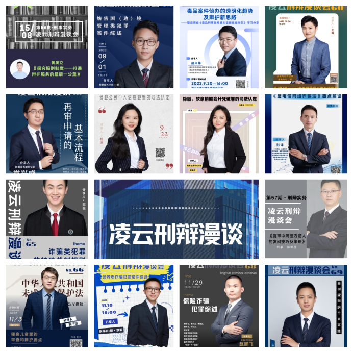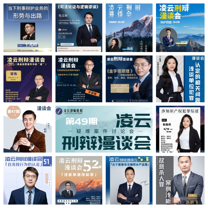 凌云刑辩漫谈会发起于凌云刑事业务中心,自成立伊始,坚持在每周五分享与交流,旨在为年轻刑辩律师搭建分享、学习、交流和锻炼的平台。规模从起初的数人逐渐发展成为如今凌云律师机构刑事专业委员会的重要组成,分享内容广泛,涵盖刑事案件办案实务、个案研究、热案解析、辩护技能及学科理论等多方面刑事辩护理论与实务经验。