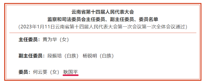 2023年1月11日,云南省第十四届人民代表大会第一次会议第一次全体会议上,耿国平代表当选云南省第十四届人民代表大会监察和司法委员会委员。