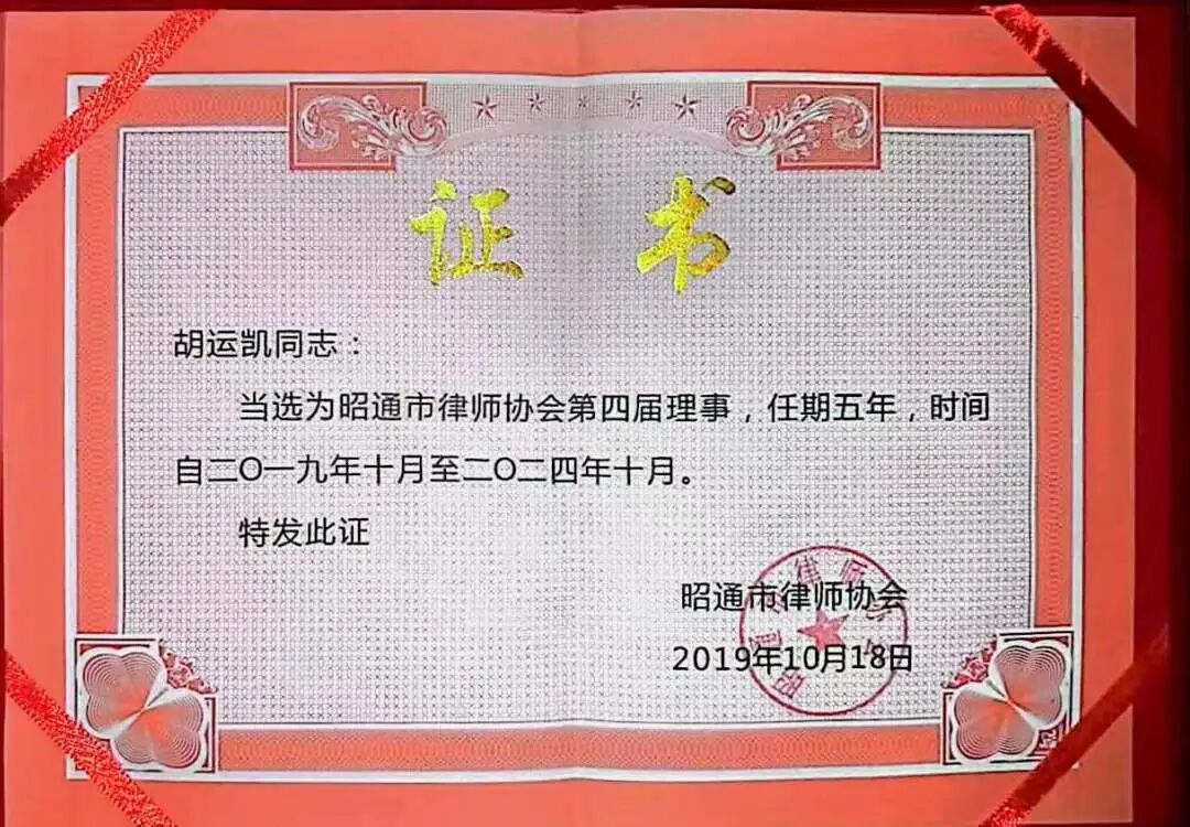 此外,胡运凯律师也同时担任昭通市律师协会第四届理事。