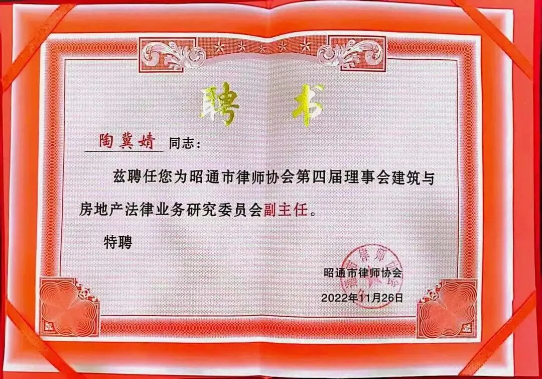 凌云昭通所主任陶冀婧受聘担任昭通市律师协会第四届理事会建筑与房地产法律业务研究委员会副主任。