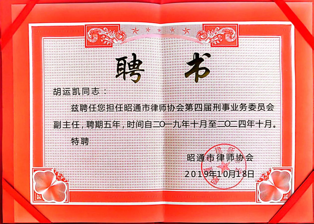 凌云昭通所执行委员会副主任胡运凯受聘担任昭通市律师协会第四届刑事法律业务研究委员会副主任。