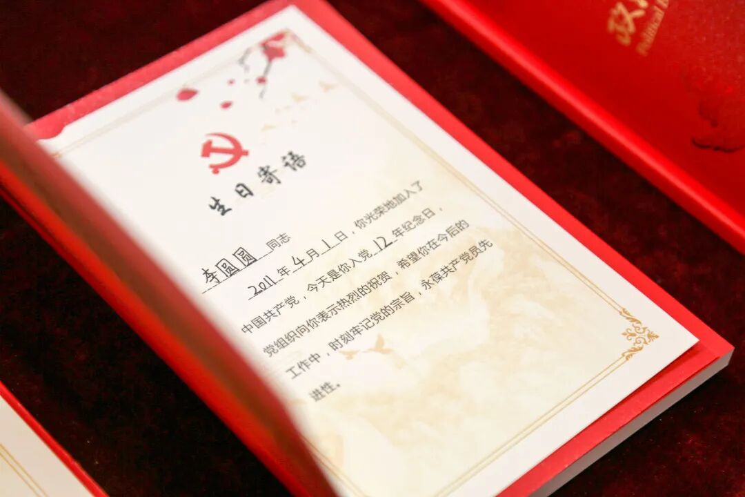 党员代表孙文杰同志为过“政治生日”的党员赠送生日贺卡、党员学习笔记。