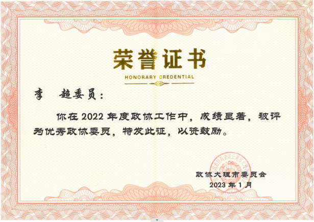 大会进行了表彰,李超律师因工作成绩显著,被表彰为2022年度优秀政协委员。