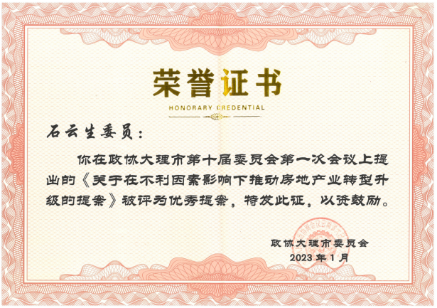 石云生律师在2022年政协大理市十届一次会议上的提案《关于在不利因素影响下推动房地产业转型升级的提案》被评为2022年度优秀提案。