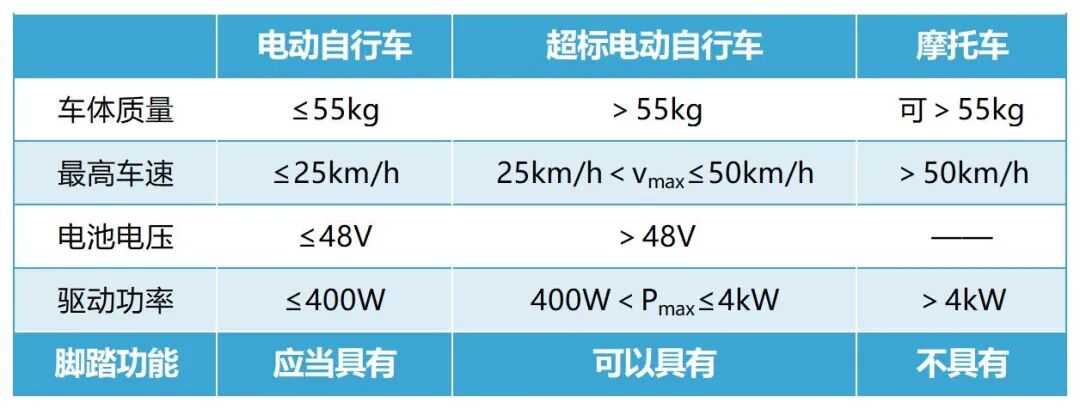 可以看出,电动自行车应当符合具有脚踏驾驶能力;具有电驱动或/和电助动功能;电驱动行驶时,最高设计车速不超过 25 km/h;电助动行驶时,车速超过 25 km/h,电动机不得提供动力输出;装配完整的电动自行车的整车质量小于或等于 55 kg;蓄电池标称电压小于或等于 48 V;电动机额定连续输出功率小于或等于 400 W的国标规定。