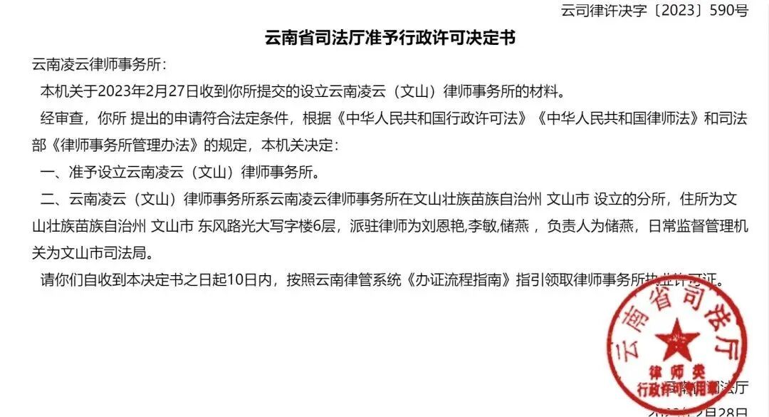 2023年2月28日,经云南省司法厅审批,准予云南凌云(文山)律师事务所设立。
