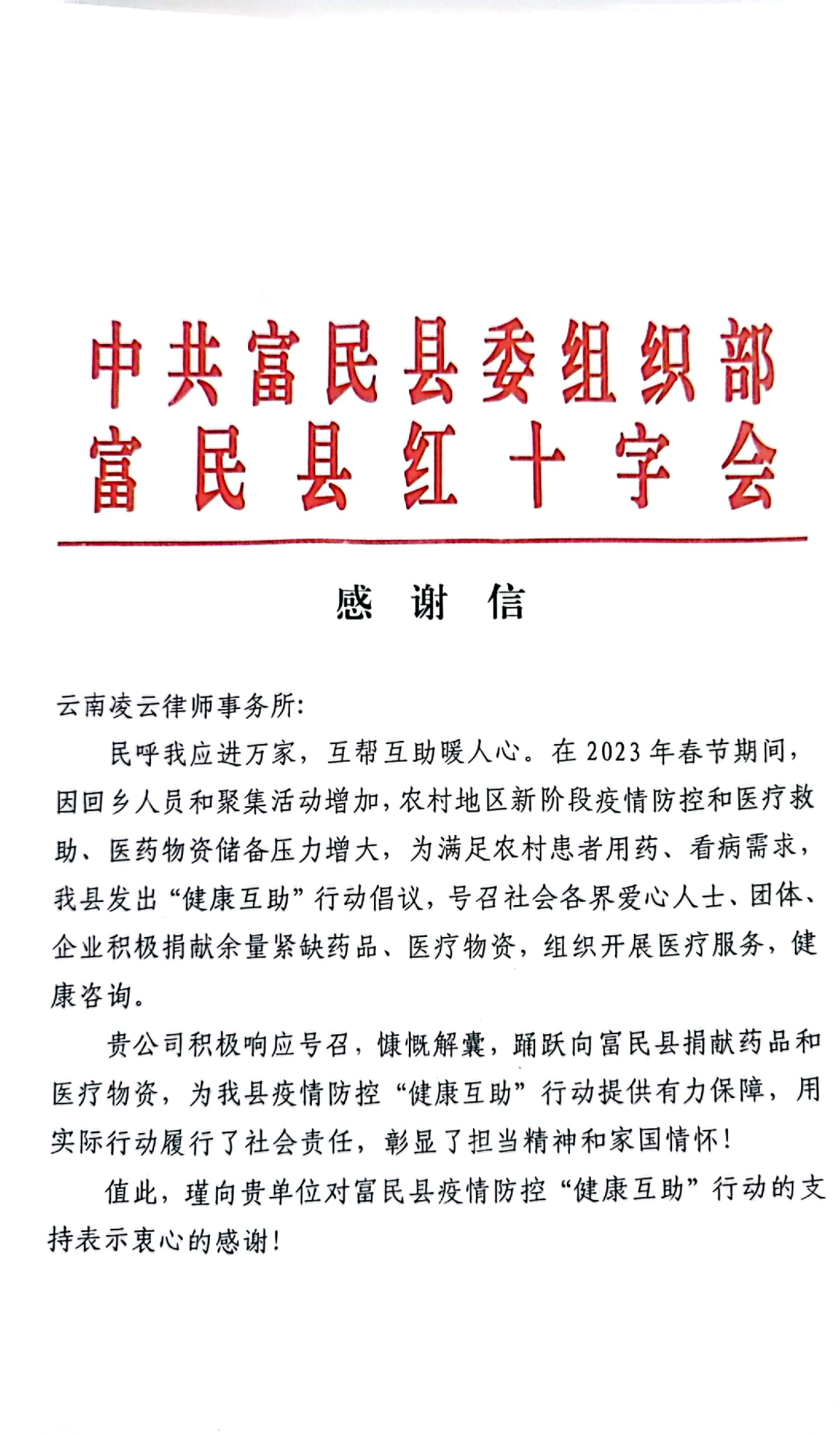 2023年3月2日,我所收到中共富民县委组织部富民县红十字会感谢信。云南凌云律师事务所作为云南本地律所,自2019年新型冠状病毒爆发以来,同心抗疫,共克时艰,成立抗疫互助共济小组,设立凌云战“疫”线上公益法律服务中心,支持一线抗疫工作,曾捐赠蔬菜数十吨,于特殊时期担负起社会责任。