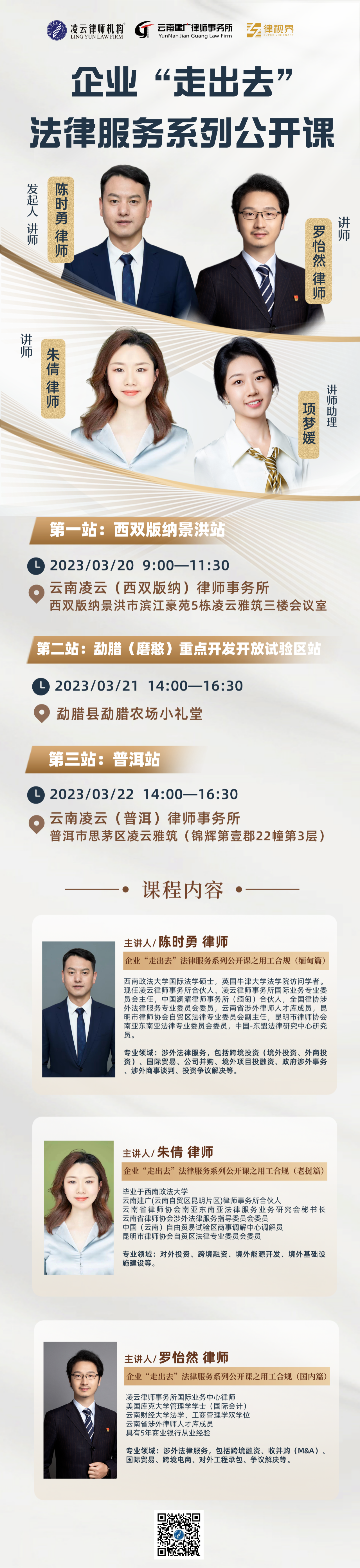 为响应“一带一路”倡议,服务我国涉外法治工作战略布局,针对企业对外劳务合作需求,帮助企业“走出去”、外商“引进来”,解决企业跨境用工合规性问题,凌云律师事务所联合云南建广律师事务所于3月20日-22日在西双版纳景洪市、勐腊(磨憨)重点开发开放试验区、普洱市三地开展企业“走出去”法律服务系列公开课。