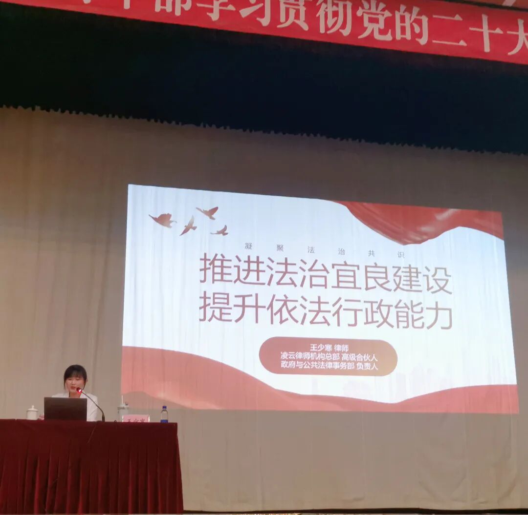 为了进一步提升宜良县行政执法人员执法水平,推动宜良县法治政府建设,提高宜良县县域治理能力,促进宜良县高质量发展。4月8日上午,凌云律师事务所高级合伙人,昆明办公室副主任,政府与公共业务中心主任王少寒律师受邀为宜良县广大干部及基层工作人员开展题为《推进法治宜良建设、提升依法行政能力》的专题讲座。
