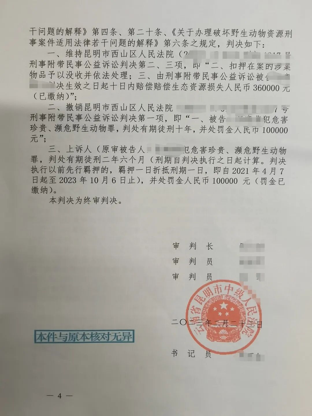 因白犀、盔犀鸟被列入《濒危野生动植物国际贸易公约》,2020年6月,张某因涉嫌危害珍贵、濒危野生动物罪被昆明海关缉私局抓获,经昆明市西山区人民法院审理,判处被告人张某有期徒刑10年,罚金10万元,赔偿生态损失36万元。