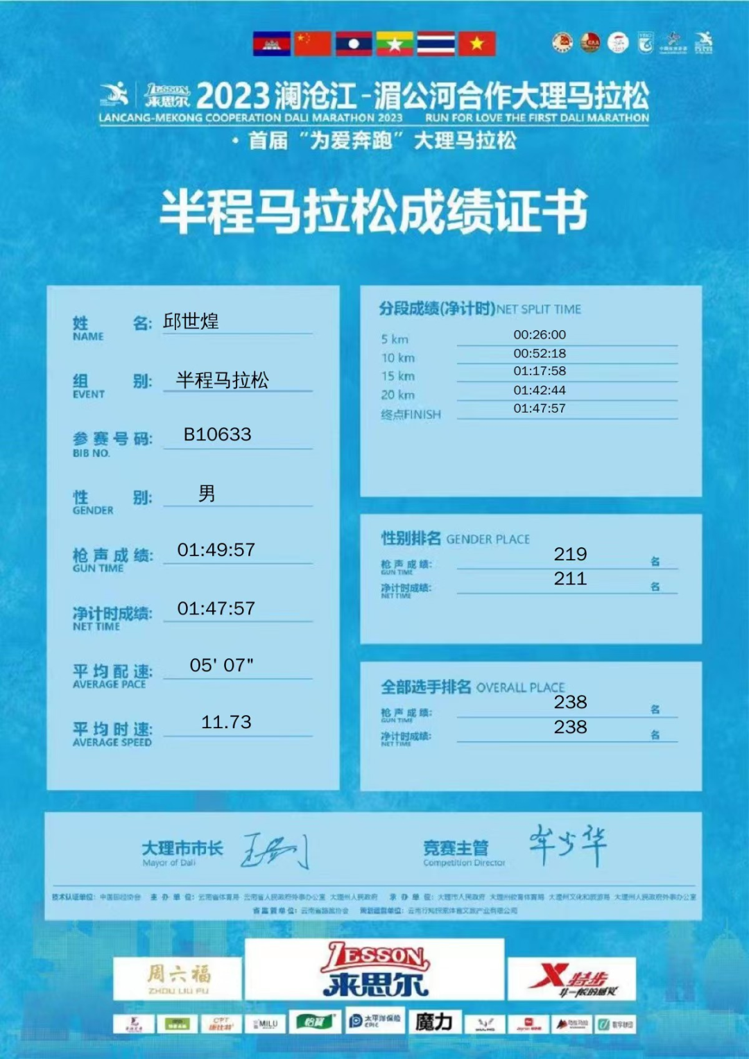 邱世煌律师以1小时47分57秒的佳绩完成21.0975公里的半马比赛。