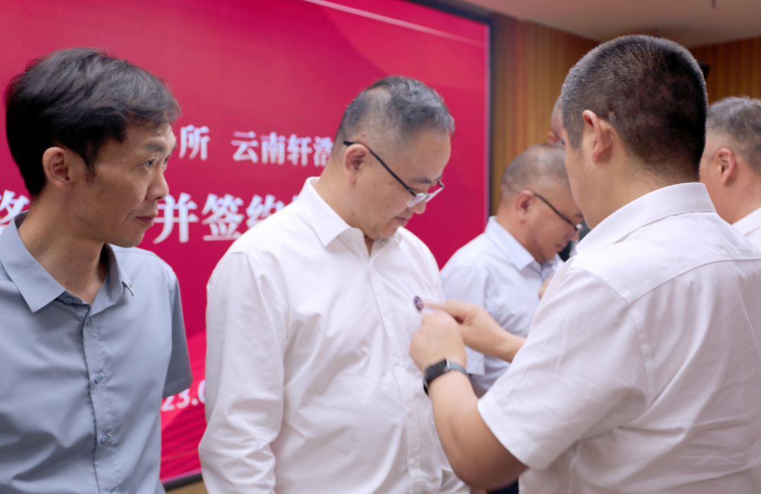 凌云总部合伙人会议主席李春光、凌云总部业务委员会主席杨崇玲为与会原轩浩所全体成员佩戴所徽,并颁发凌云文创笔记本。