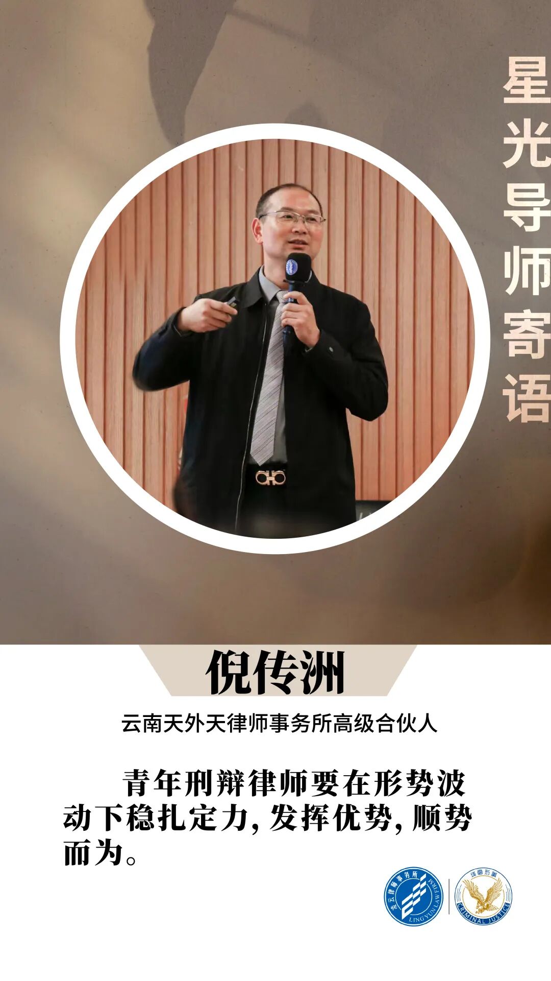 上午首节课程,由天外天律师事务所刑事专业委员会倪传洲主任带来题为《青年刑辩律师的职业价值实现》的分享。