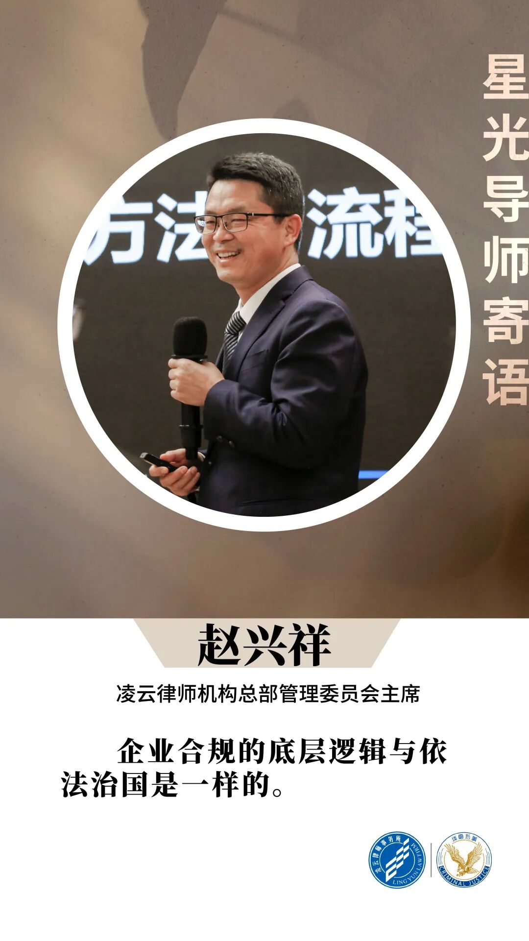 紧随后的第二节课程,我们邀请到凌云律师机构总部管委会主席赵兴祥律师,为大家进行题为《刑事合规的方法与流程》的讲授。