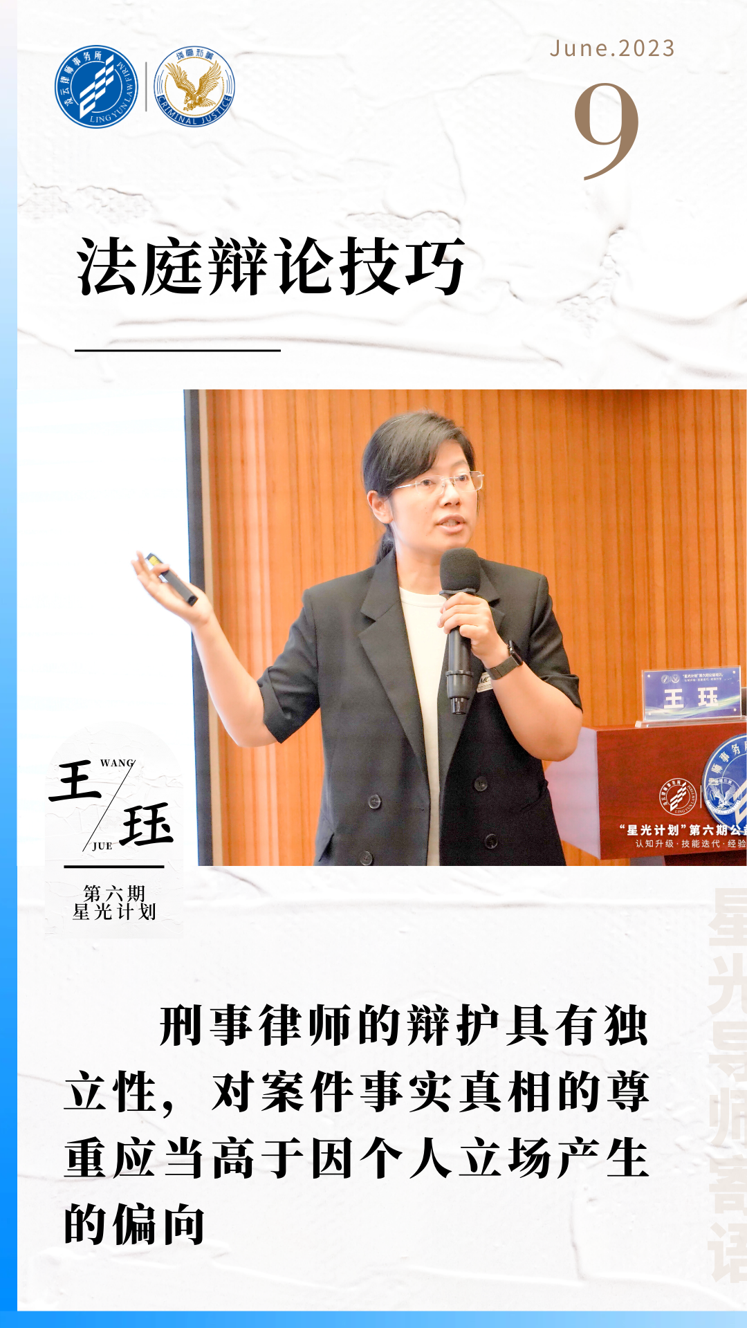 最后,针对如何提高庭审辩论效果、如何改良自身庭风方面的问题,王珏律师给出了“标准化的措辞,口语化的句式”的建议,同时为学员们归纳出了具体方法论:在庭审口语化辩论时“句子不长、法条少念、概念拆分、融入案件”;在撰写辩护词时“格式规范、态度明确、法言法语、避免反问”。