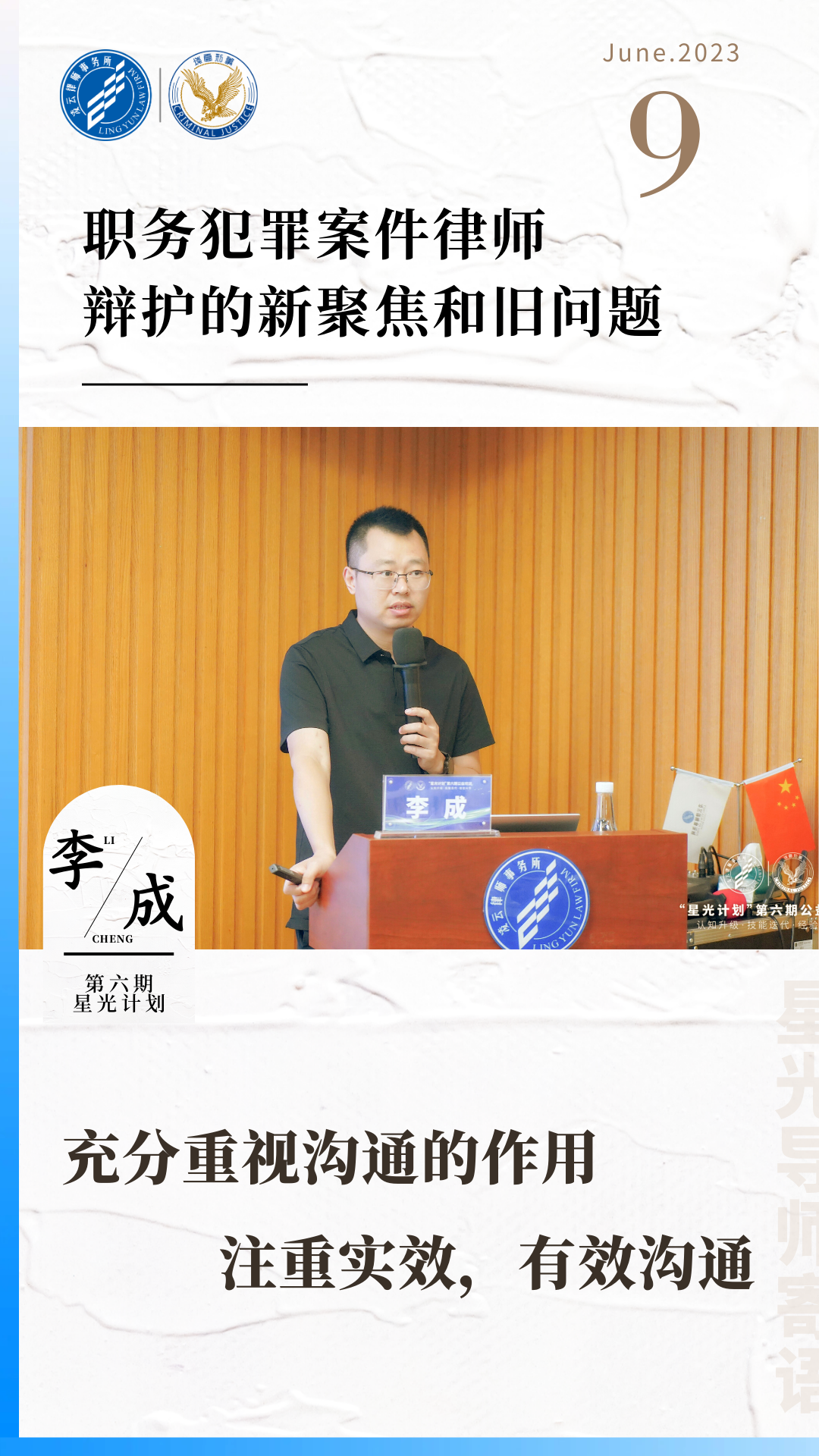 在短短的两个小时的授课时间内,李成律师洞见症结,抽丁拔楔,深刻剖析职务犯罪案件律师辩护的新焦点和旧问题,并总结在新焦点和旧问题的情形下律师辩护的对策。李成老师为“星光计划”第六期学员分享了诸多干货,有实用性极强的办案技能,也有引发学员深思的非凡洞见。