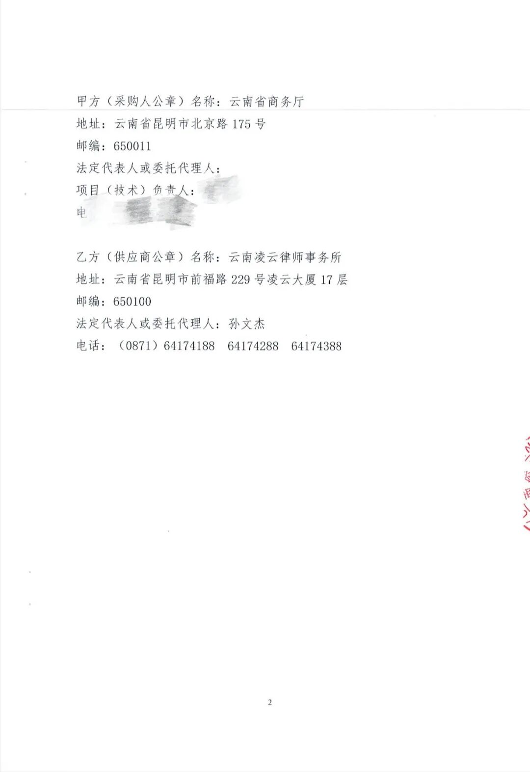 2023年6月30日,云南省商务厅与云南凌云律师事务所签订《云南省政府采购合同书》,云南凌云律师事务所指派耿国平、李丹丹等7名律师组成服务团队,为“第7届中国—南亚博览会暨第27届中国昆明进出口商品交易会”提供全程专项法律服务。