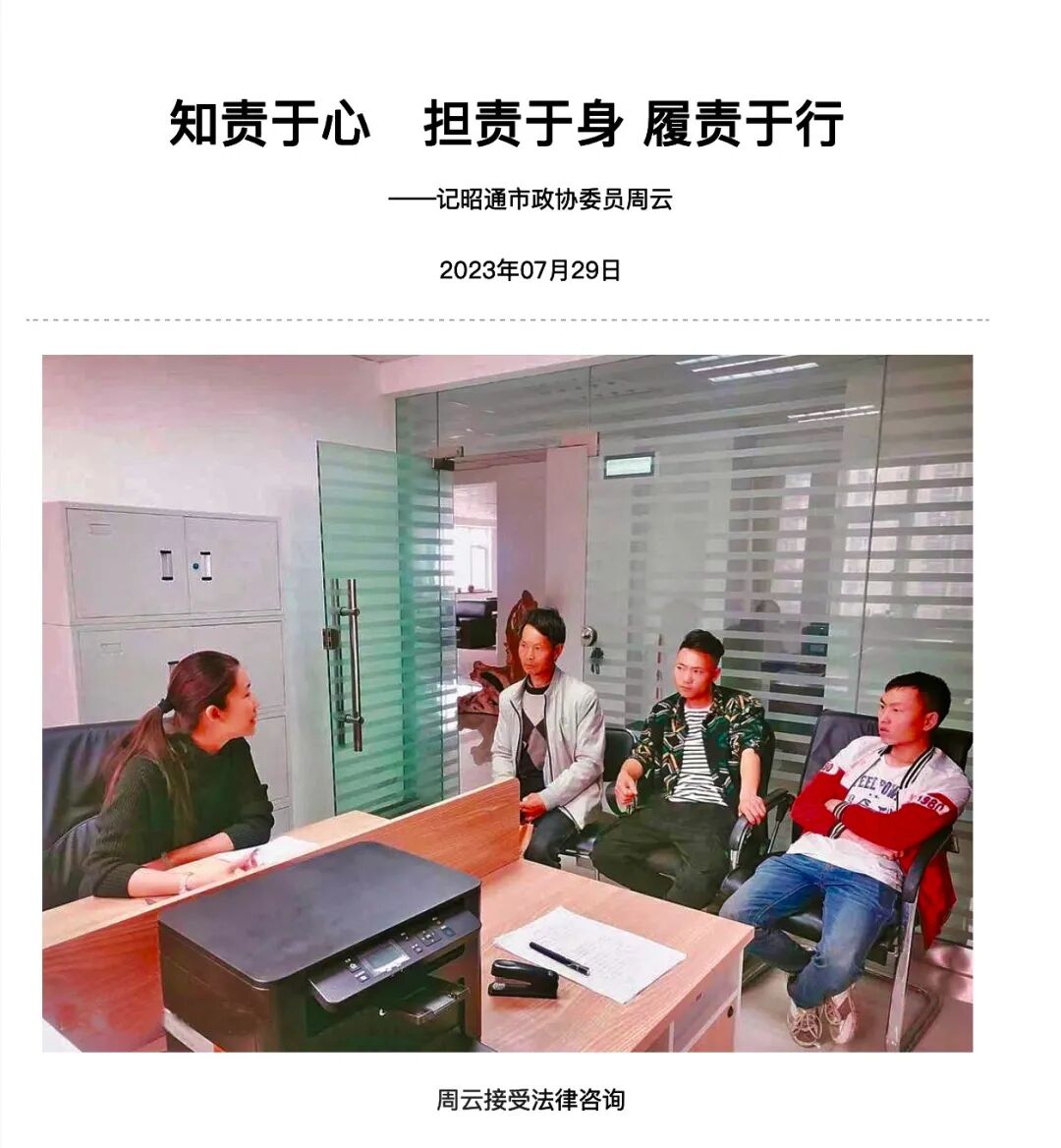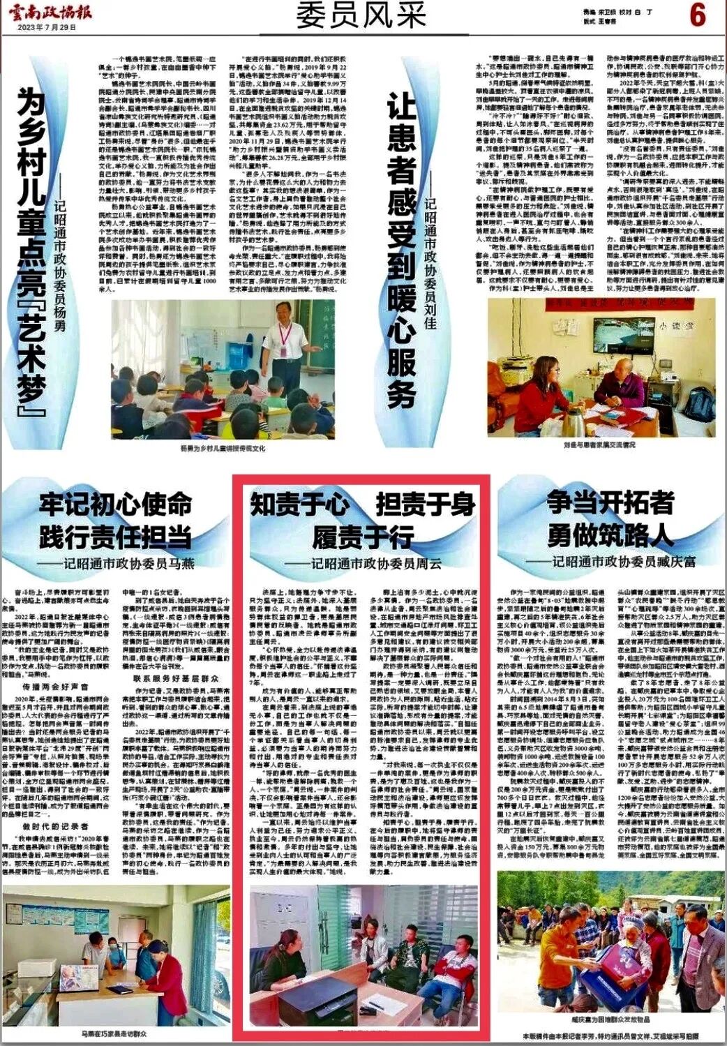 云南政协报7月29日第06b版“委员风采”专栏以“知责于心 担责于身 履责于行—记昭通市政协委员周云”为题,对我所昭通分所副主任周云律师进行了专题报道。