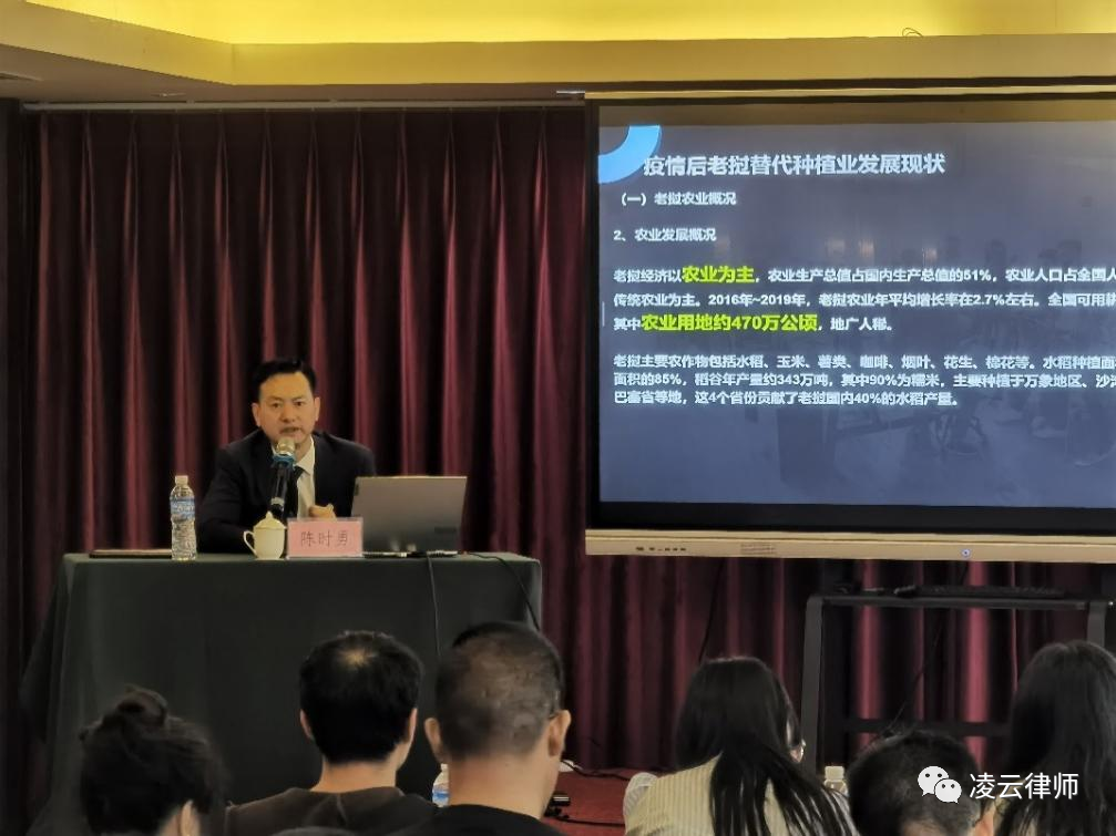 陈时勇律师以 “境外合同法务风险防控”为主题,从缅甸、老挝两国特殊国情为切入点,分别分析了我省企业在缅北、老北从事罂粟替代种植需要关注的涉外合同法律风险,为参会企业提供在缅北、老北从事替代种植业,以及跨境农业合作方面如何规避法律风险的建议。